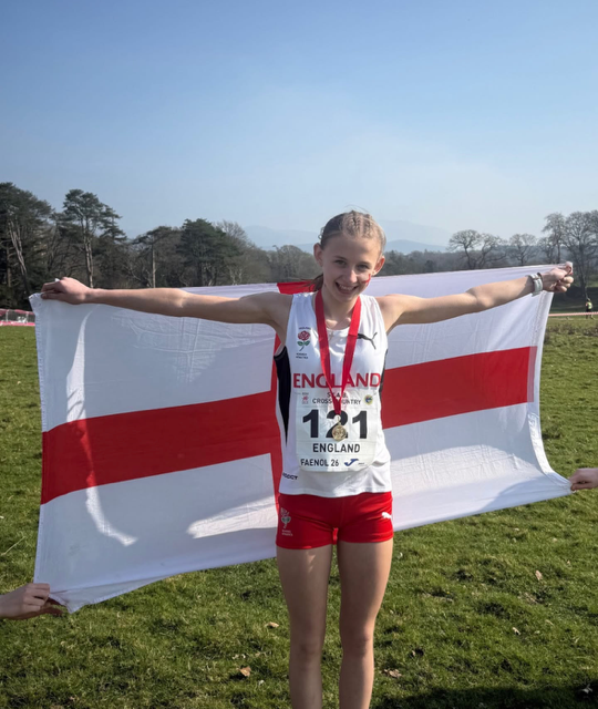 Congratulations to Mia McGoldrick who gained her first ESAA International vest at the SIAB meeting in Bangor, North Wales on Saturday 21st March 2026. She ran in the England Junior Girls team against, Ireland, Scotland and host Wales. Her team came first. Well done Mia, we are all very proud of you.